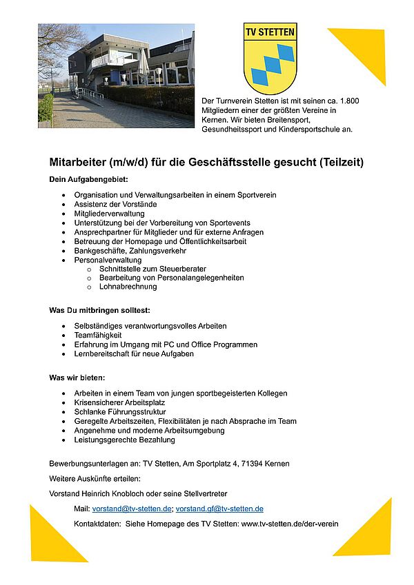 Ihre Bewerbungsunterlagen senden Sie bitte an den TV Stetten i.R. e.V., Am Sportplatz 4, 71394 Kernen, E-Mail [info@tv-stetten.de]
